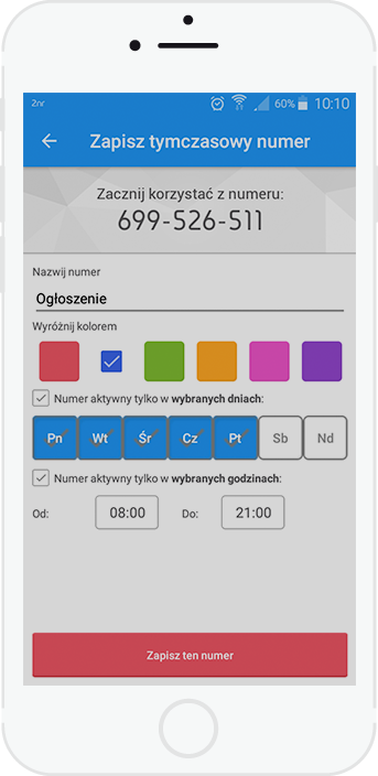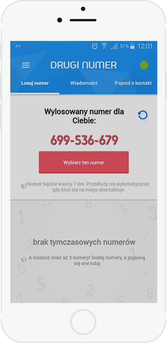 Za pośrednictwem aplikacji samodzielnie losujesz numery, które staną się Twoim dodatkowym narzędziem w pracy, w wystawianiu ogłoszeń czy w życiu towarzyskim. Po wybraniu numeru od razu możesz odbierać połączenia przychodzące oraz wiadomości SMS/MMS.