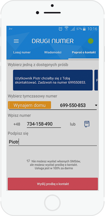 W związku z tym, że usługa jest darmowa Aplikacja 2nr nie umożliwia wysyłania własnych SMS oraz dzwonienia (połączeń wychodzących).