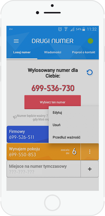 Za pośrednictwem aplikacji samodzielnie losujesz numery, które staną się Twoim dodatkowym narzędziem w pracy, w wystawianiu ogłoszeń czy w życiu towarzyskim. Po wybraniu numeru od razu możesz odbierać połączenia przychodzące oraz wiadomości SMS/MMS.